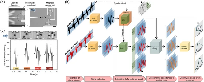 Accurate single-cell analysis is critical for diagnostics, immunomonitoring, and cell therapy, but coincident events, where multiple cells overlap in a sensing zone, can severely compromise signal fidelity. A hybrid framework combining a fully convolutional neural network (FCN) with compressive sensing (CS) to disentangle such overlapping events in 1D sensor data is presented. The FCN, trained on bead-derived datasets, accurately estimates coincident event counts and generalizes to immunomagnetically labeled CD4+ and CD14+ cells in whole blood without retraining. Using this count, the CS module reconstructs individual signal components with high fidelity, enabling precise recovery of single-cell features, including velocity, amplitude, and hydrodynamic diameter. Benchmarking against conventional state-machine algorithms shows superior performance, recovering up to 21% more events and improving classification accuracy beyond 97%. Explainability via class activation maps and parameterized Gaussian template fitting ensures transparency and clinical interpretability. Demonstrated with magnetic flow cytometry (MFC), the framework is compatible with other waveform-generating modalities, including impedance cytometry, nanopore, and resistive pulse sensing. This work lays the foundation for next-generation nonoptical single-cell sensing platforms that are automated, generalizable, and capable of resolving overlapping events, broadening the utility of cytometry in translational medicine and precision diagnostics, e.g., cell-interaction studies.