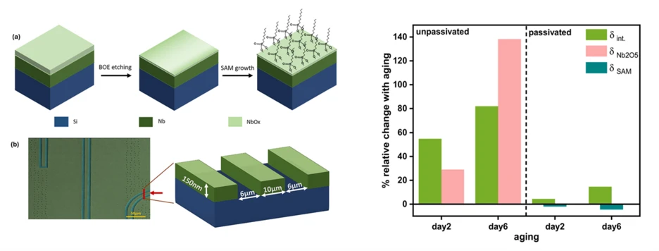Harsh Gupta, Rui Pereira, Leon Koch, Niklas Bruckmoser, Moritz Singer, Benedikt Schoof, Manuel Kompatscher, Stefan Filipp, Marc Tornow, High temporal stability of niobium superconducting resonators by surface passivation with organophosphonate self-assembled monolayers, Communications Materials (2026), https://doi.org/10.1038/s43246-025-01068-8