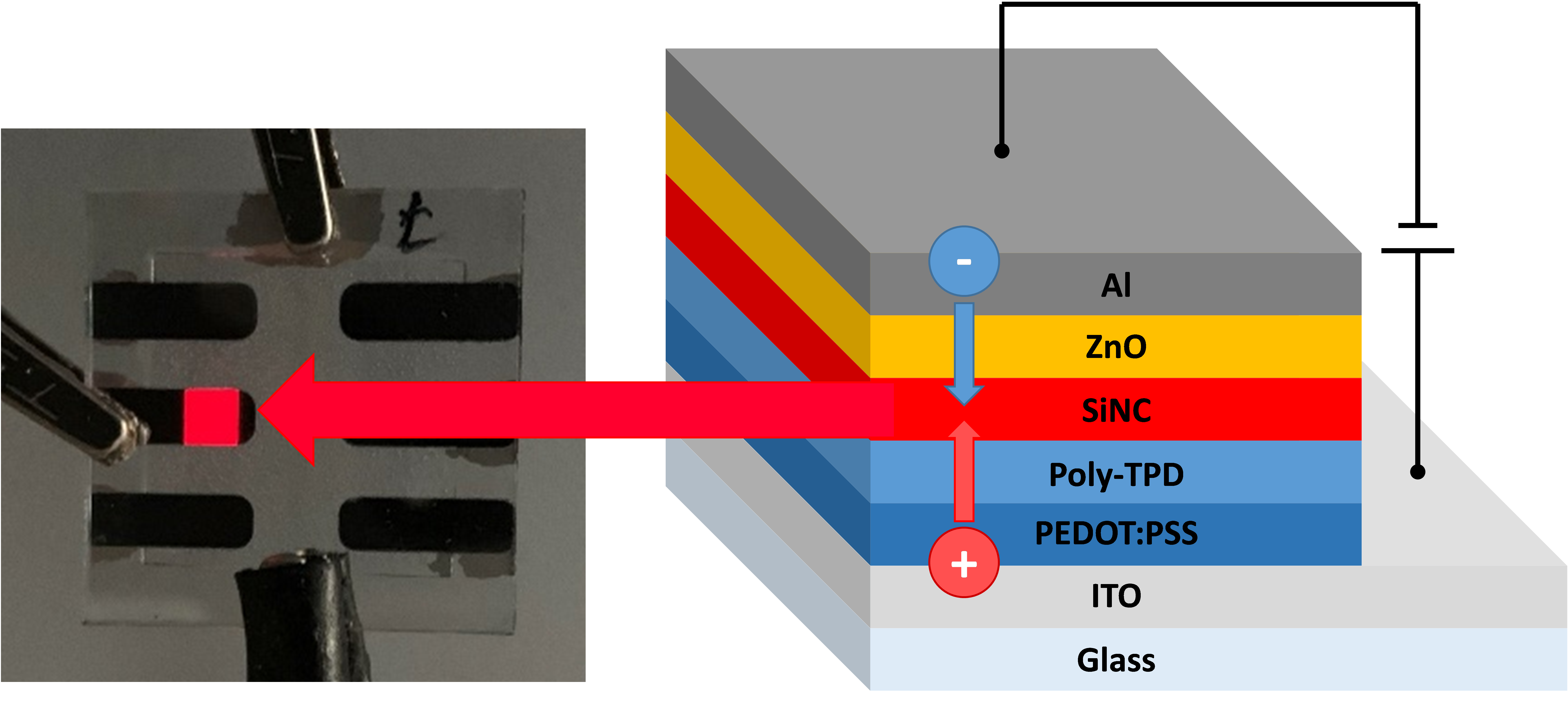 We fabricate SiNC-LEDs or Si quantum dot LEDs (Si-QLEDs) which are an interesting alternative to organic light emitters. The advantage of QLEDs is that they are mostly inorganic and show a narrower emission spectra combined with a potential flexibility of the OLEDs. The drawback of the commonly used II-VI and IV-VI nanocrystals is that they are based on Cd or Pb, for example, CdSe and PbS and therefore toxic. Since the European Union wants to reduce the amount of toxic materials in electronics, alternatives such as SiNCs are needed.
